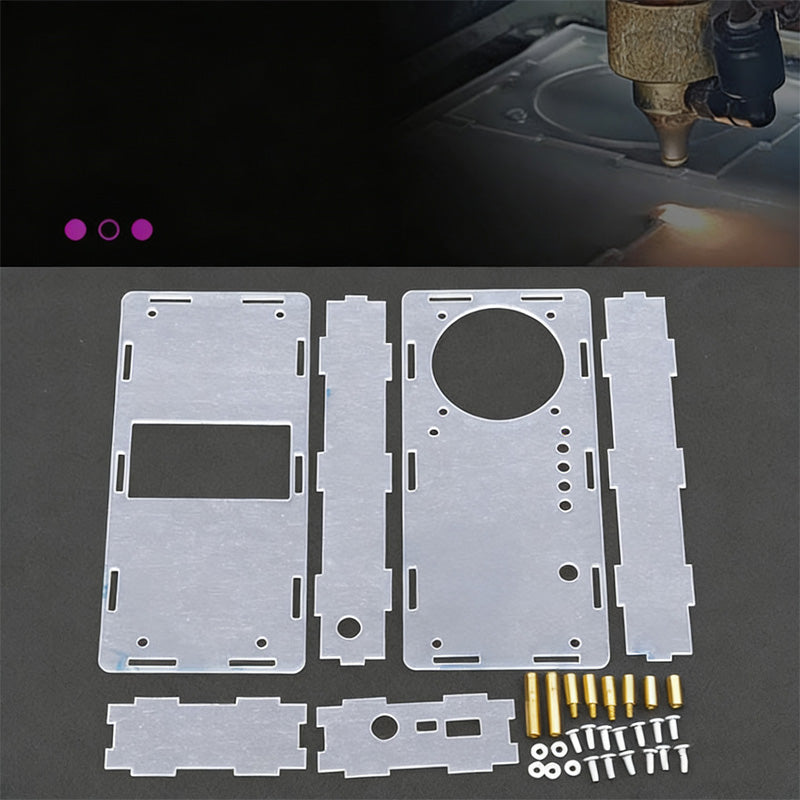BOÎTIER EN ACRYLIQUE DÉCOUPÉ AVEC PRÉCISION - Le kit est enfermé dans un boîtier en acrylique transparent et durable, découpé au laser avec précision pour un ajustement parfait. Il protège les composants internes tout en offrant une vue dégagée sur les circuits assemblés.