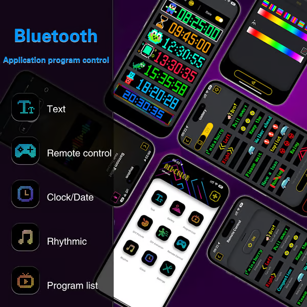 le panneau LED est contrÎlé par une application connectée via Bluetooth, qui prend en charge la connexion simultanée de plusieurs écrans LED, rendant votre magasin plus attrayant. L'application intÚgre de nombreux modes et animations intéressants. Votre téléphone vous permet de personnaliser facilement des modÚles et des textes amusants pour personnaliser votre magasin.