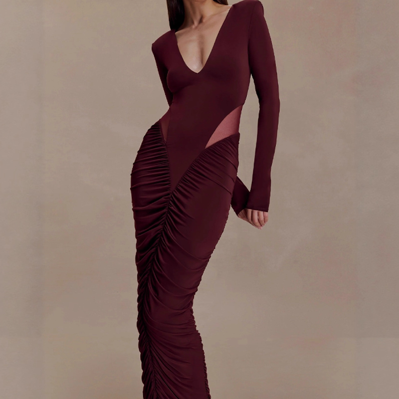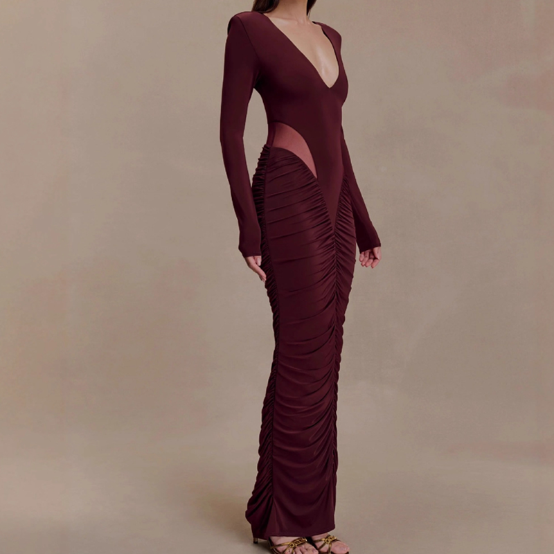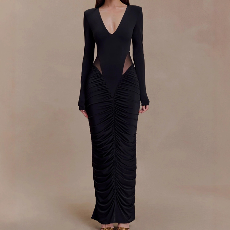 Robe longue moulante sexy à encolure en V et découpes froncées
